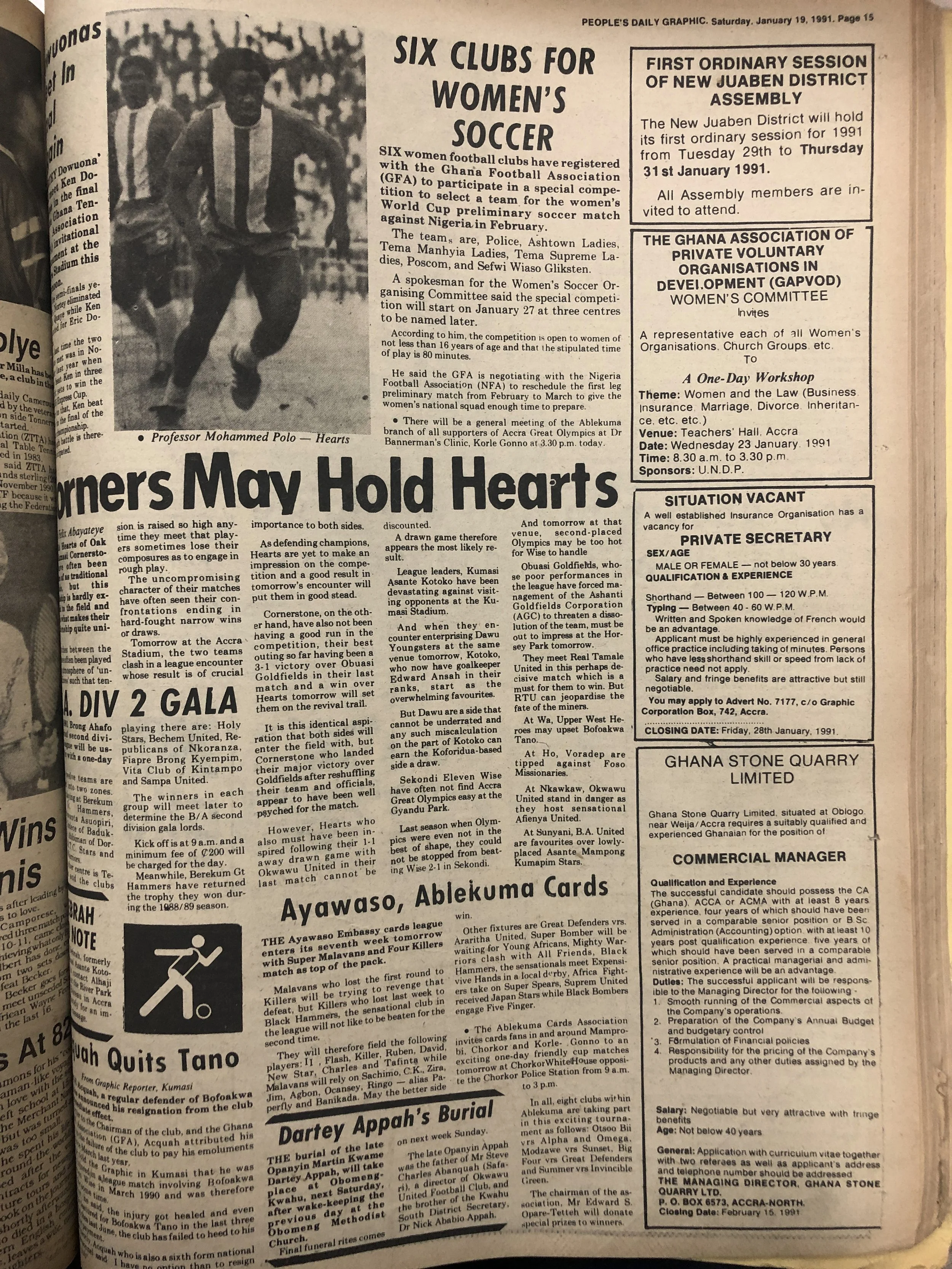 “Six Clubs for Women’s Soccer,” People’s Daily Graphic, Saturday January 19, 1991. This is one of the first articles to talk about the possibility of a Ghanaian women’s national soccer team.